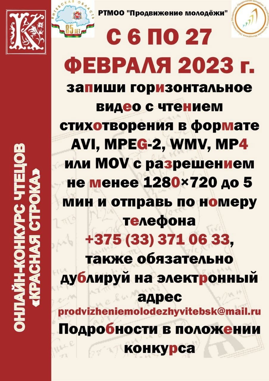 Республиканское творческое молодёжное объединение «Продвижение молодёжи» объявляет о старте онлайн-конкурса чтецов «Красная строка», приуроченного к месячнику военно-патриотического воспитания и 85-летию Витебской области